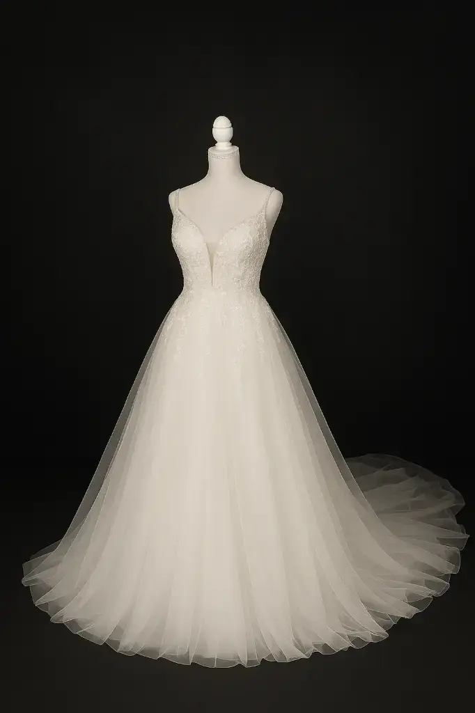 Dieses zarte, handgenähte Meisterstück vereint einen fließenden Tüllrock mit einem fein bestickten Oberteil – jedes Blatt- und Blütenmotiv wurde sorgfältig von Hand aufgenäht. Das Ergebnis ist ein Kleid, das in jeder Bewegung lebendig wird und im Licht sanft schimmert.