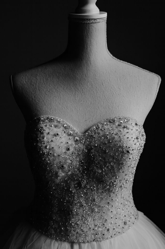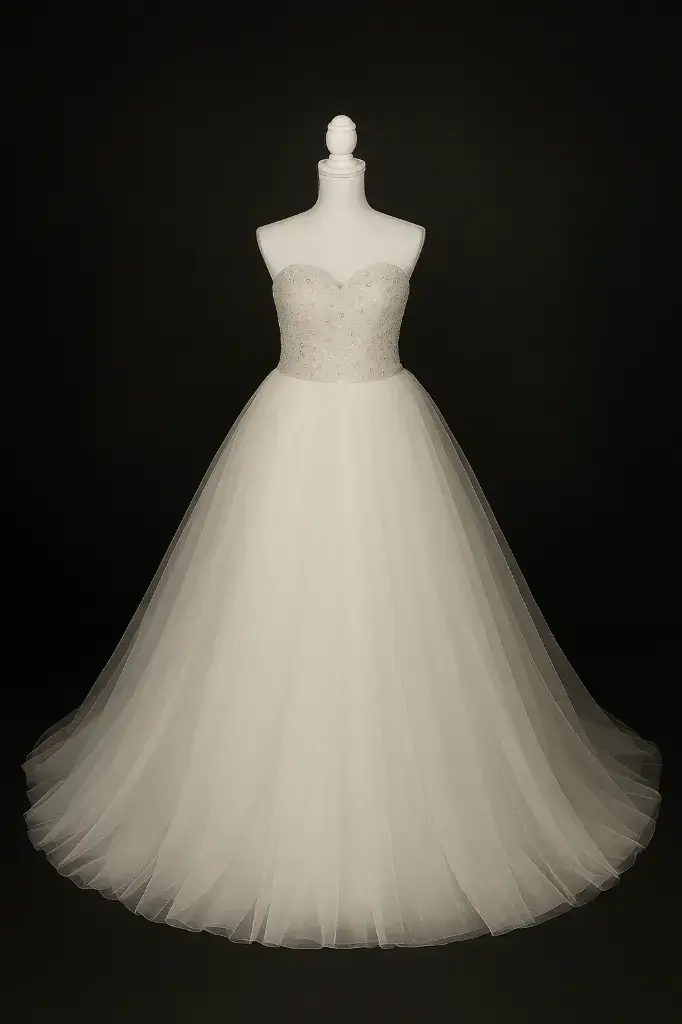 Das funkelnde Korsett mit herzförmigem Ausschnitt ist reich bestickt mit glitzernden Steinen und Perlen, die in jedem Lichtspiel leuchten. Der voluminöse Tüllrock verleiht dem Kleid eine majestätische Silhouette, die an klassische Märchen erinnert – perfekt für einen unvergesslichen Auftritt.