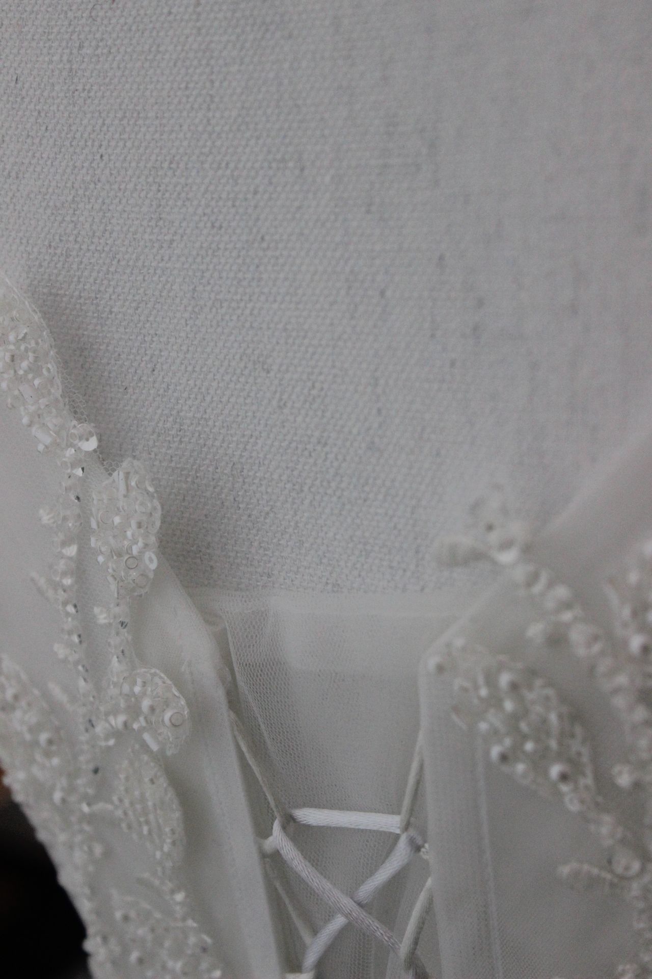 Trotz seiner aufwendigen Verarbeitung ist Aria besonders leicht zu tragen, perfekt für einen langen Hochzeitstag voller Emotionen, Tanz und unvergesslicher Momente. Der tiefe Ausschnitt wird durch transparente Einsätze elegant balanciert und die feine Schnürung am Rücken sorgt für Flexibilität und eine perfekte Passform.