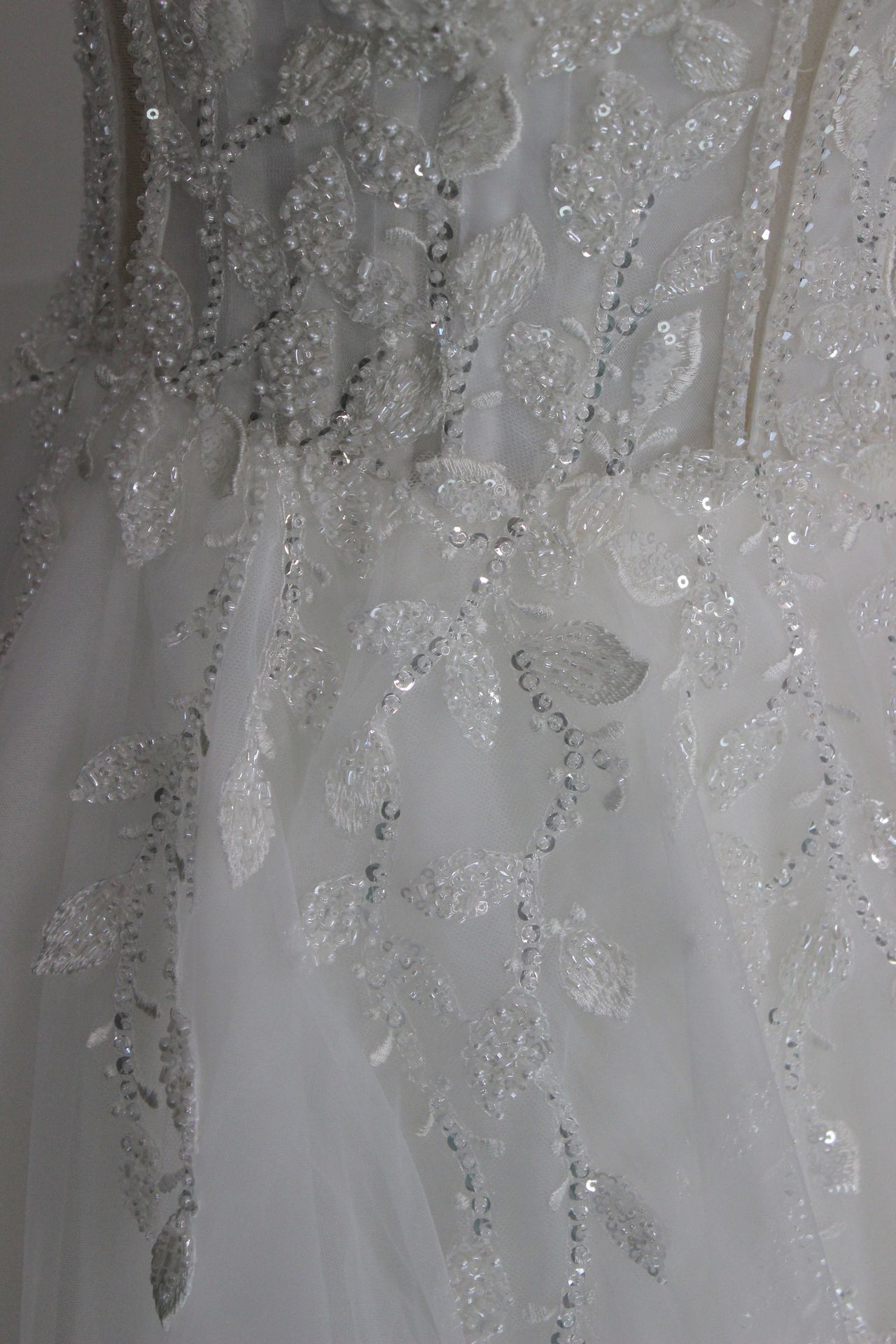 Dieses zarte, handgenähte Meisterstück vereint einen fließenden Tüllrock mit einem fein bestickten Oberteil – jedes Blatt- und Blütenmotiv wurde sorgfältig von Hand aufgenäht. Das Ergebnis ist ein Kleid, das in jeder Bewegung lebendig wird und im Licht sanft schimmert.