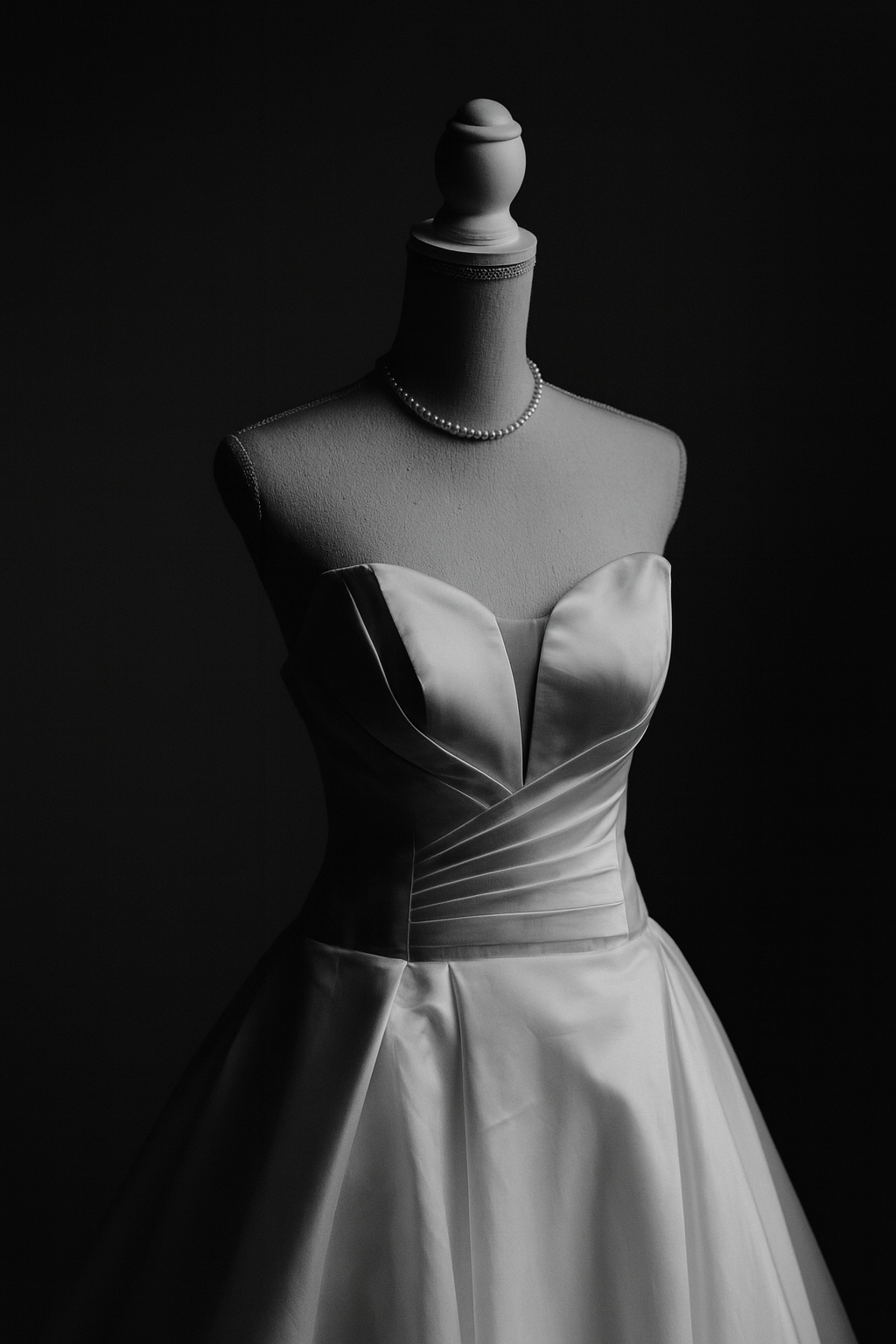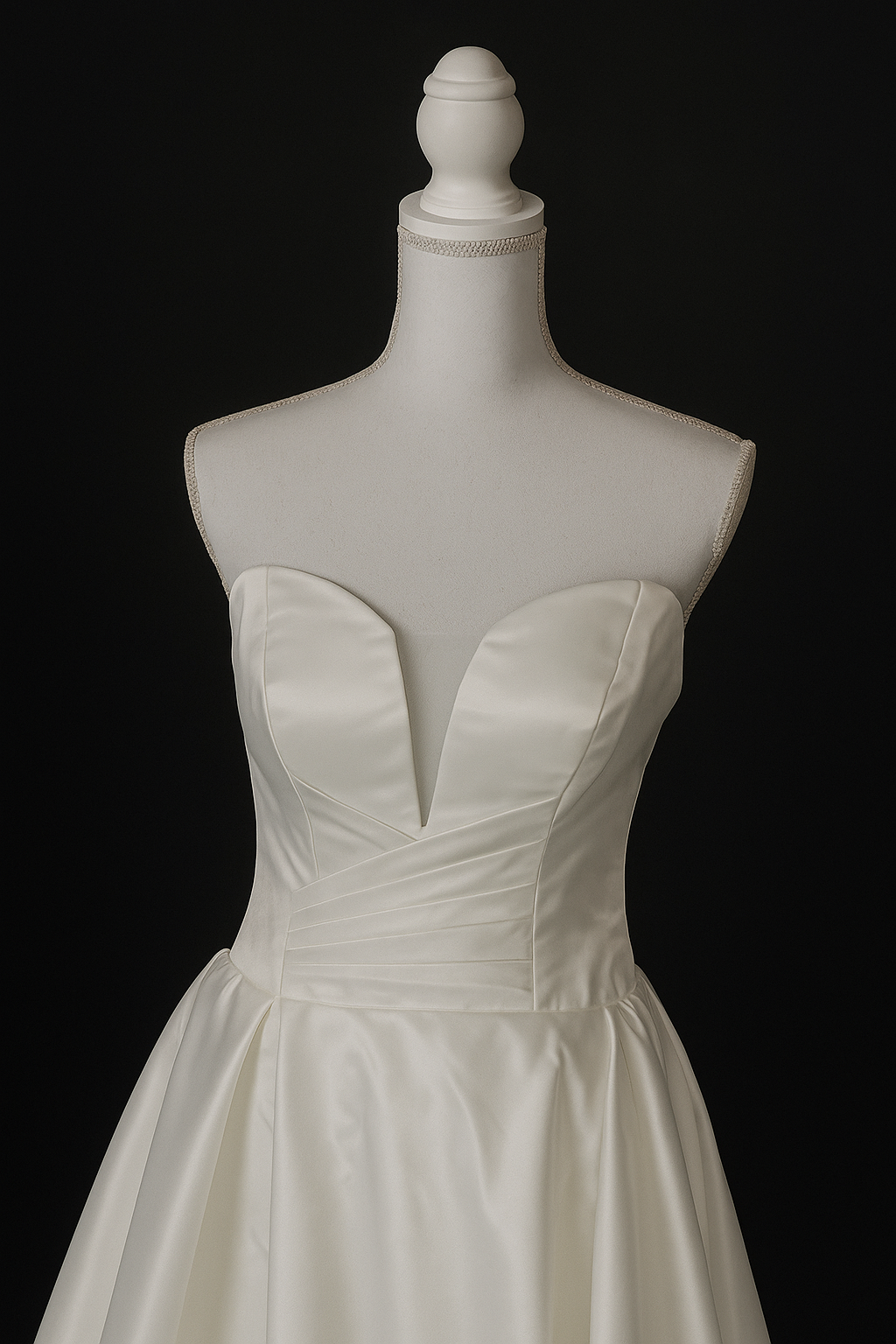 Der tiefe, herzförmige Ausschnitt mit strukturierter Corsage betont das Dekolleté auf stilvolle Weise, während der edel schimmernde Stoff in Bewegung kraftvoll und weich zugleich wirkt. Die gefaltete Taille sorgt für eine elegante Silhouette, ohne einzuengen.